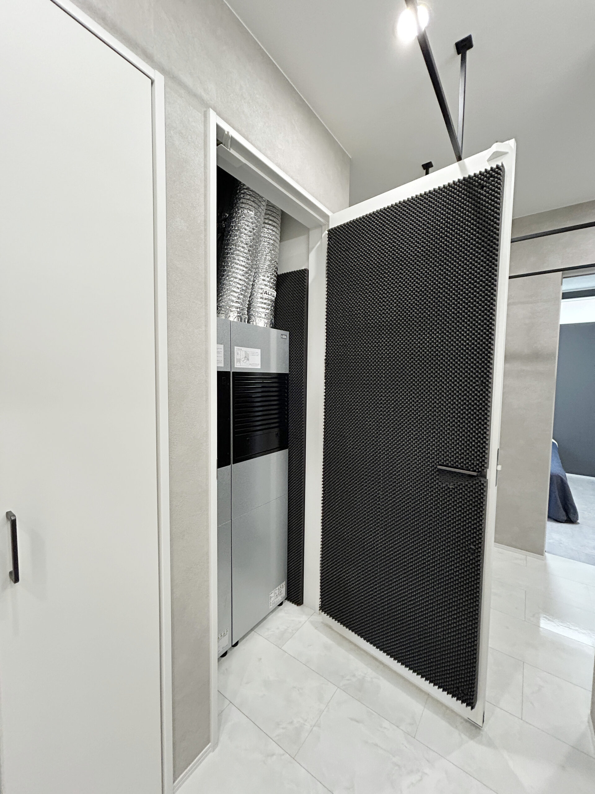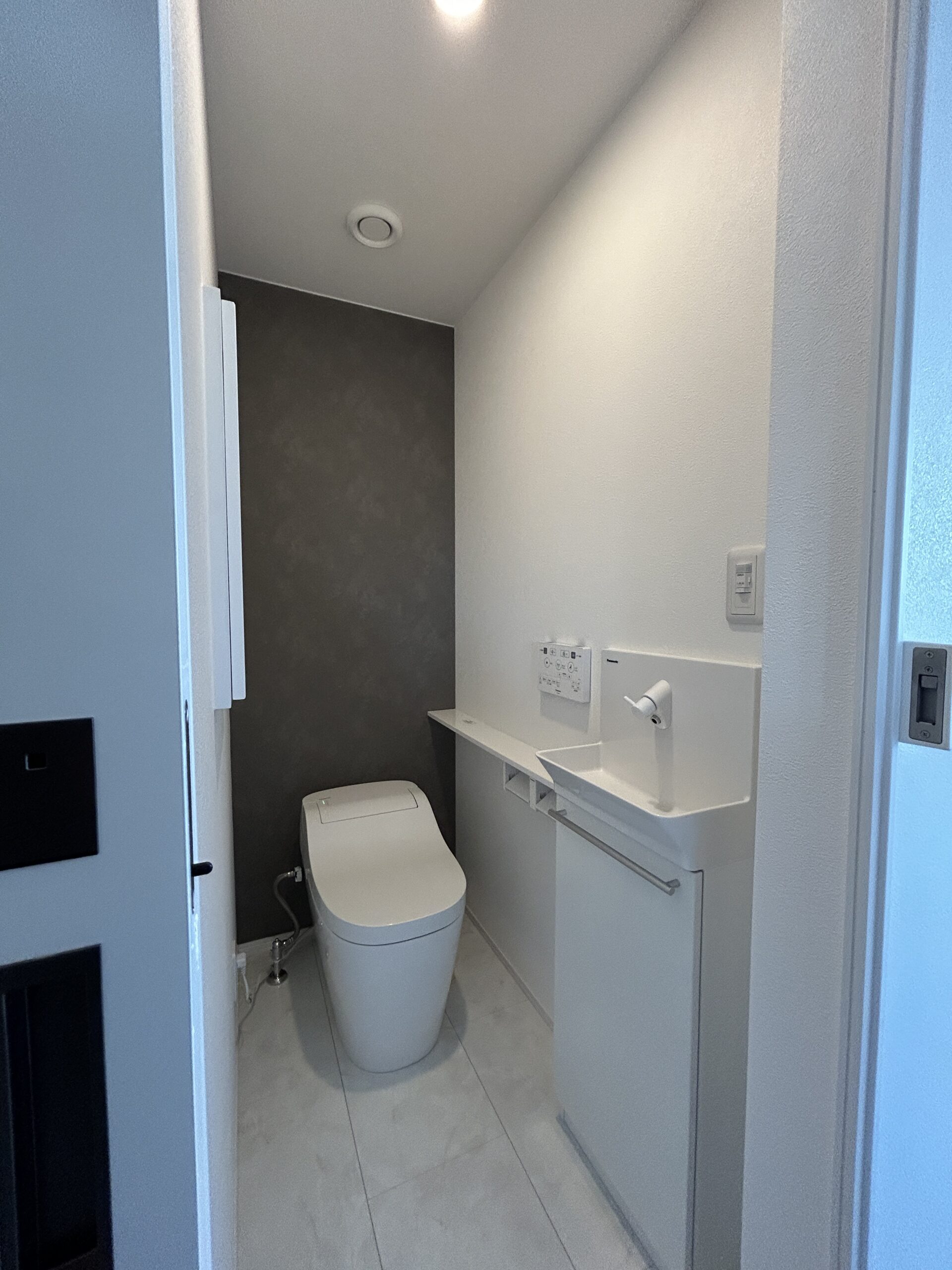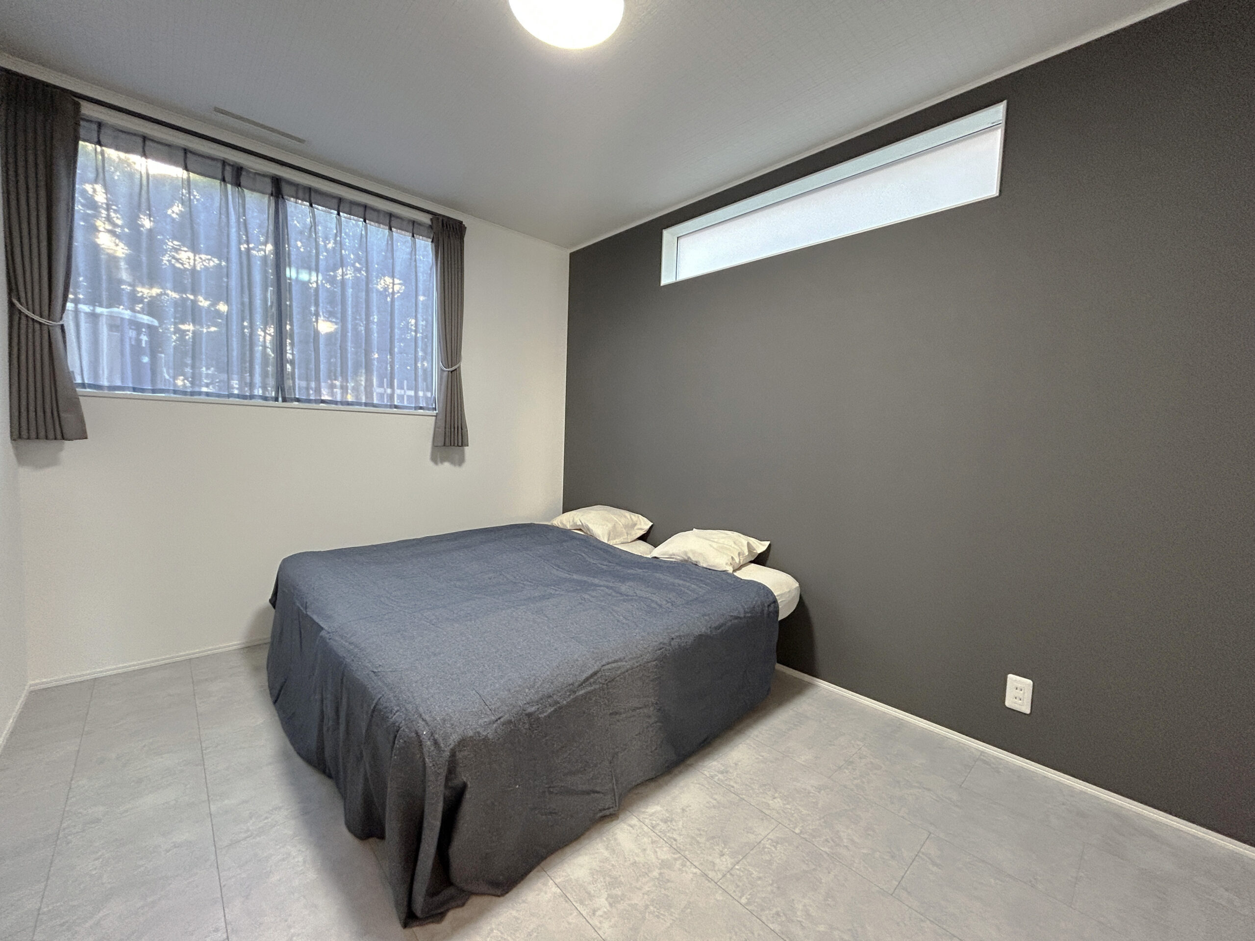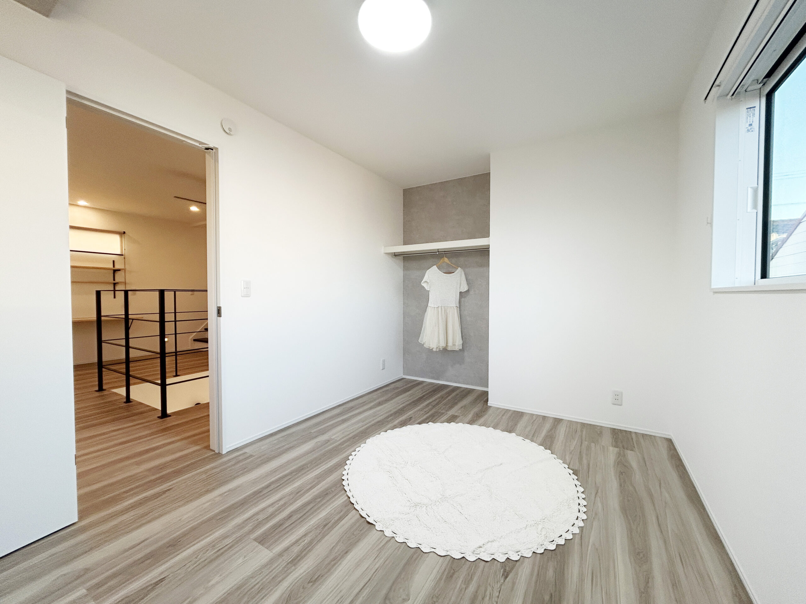 クローゼットの先には、グレーのアクセントクロスが落ち着く寝室